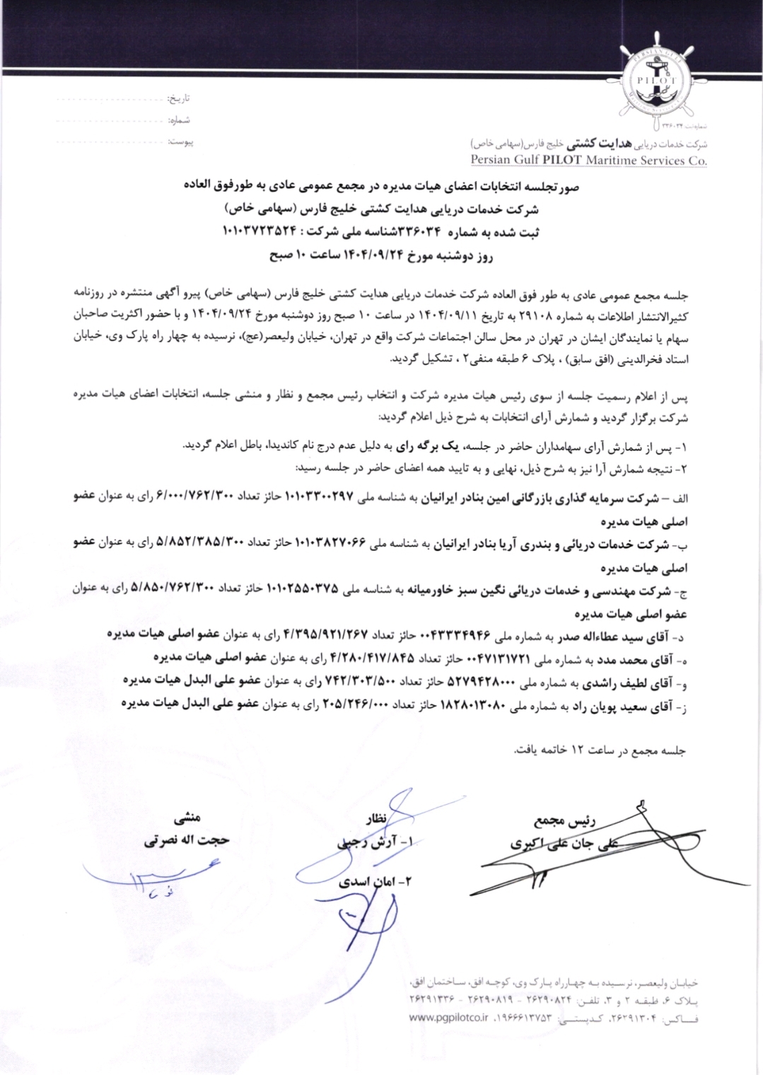 صورتجلسه مجمع عمومی بطور فوق العاده انتخاب اعضای هیئت مدیره شرکت خدمات دریایی و بندری هدایت کشتی خلیج فارس