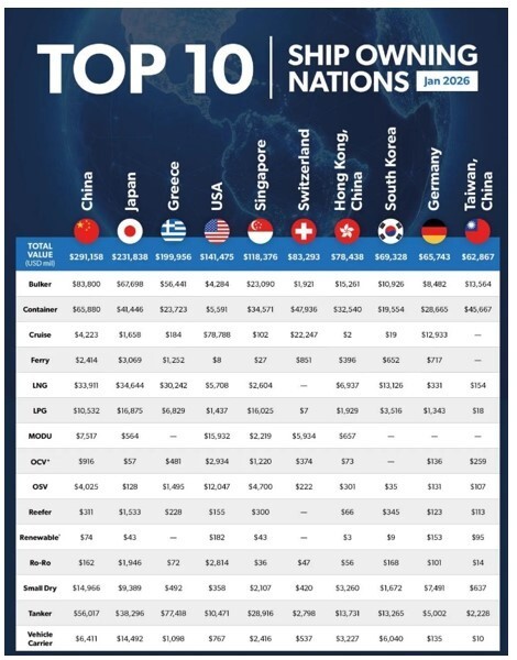 چین جایگاه نخست را هم از نظر ارزش دارایی و هم تعداد کشتی حفظ کرده است. ارزش ناوگان این کشور با ۹ هزار و ۳۷۵ کشتی به ۲۹۱ میلیارد دلار میرسد. این رقم نسبت به ۲۵۵ میلیارد دلار سال ۲۰۲۵ رشد ۴ درصدی را نشان میدهد.