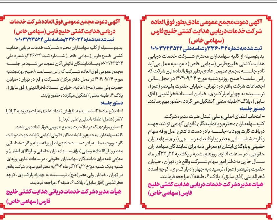 مجمع عمومی فوق العاده شرکت خدمات دریایی و بندری هدایت کشتی خلیج فارس راس ساعت 8 صبح مورخ 24 آذر ماه و مجمع عمومی عادی بطور فوق العاده