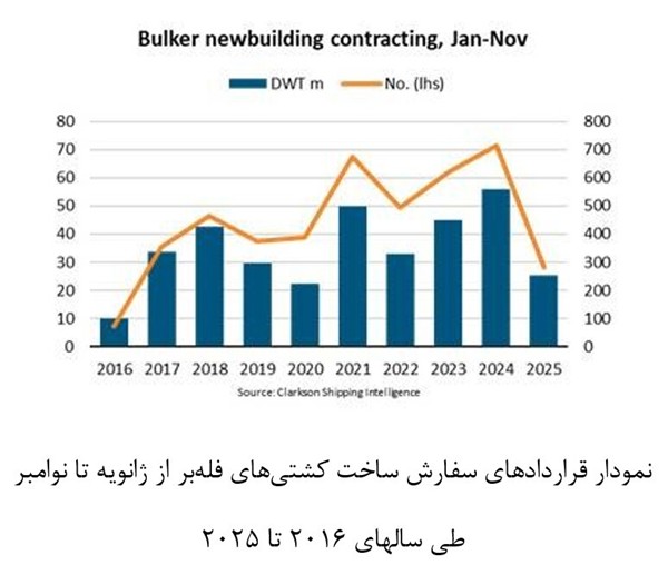 براین اساس تعداد کشتیهایی که قرارداد سفارش ساخت آنها منعقد شده کاهش شدیدتری را تجربه کرده و از ابتدای سال ۲۰۲۵ تاکنون ۶۱ درصد نسبت به سال گذشته کاهش یافته است. در سال ۲۰۲۵ تنها ۲۸۱ کشتی سفارش داده شده که کمترین تعداد از سال ۲۰۱۶ است. در حالی که قراردادها در تمام بخشهای فله کاهش یافته است، سفارشات در بخش کیپ سایز، که شامل بزرگترین کشتیها در ناوگان فله خشک است، تا حدودی بالاتر بوده است.